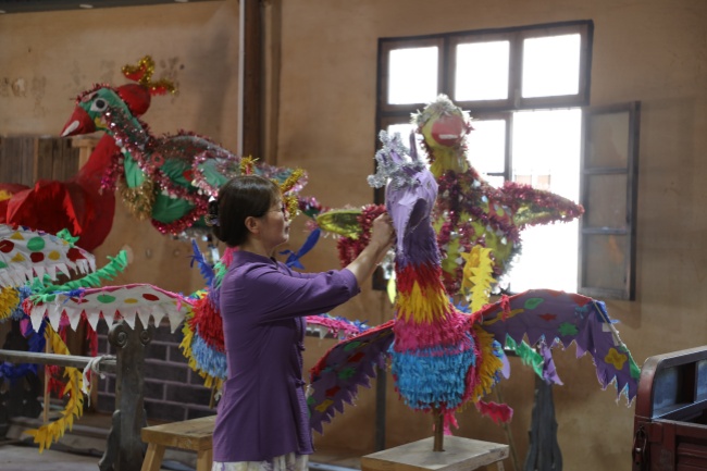 今年8月,“雉山凤舞”非遗项目第六代传承人余红英在细心整理演出道具。